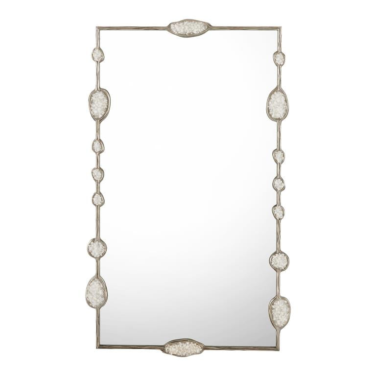 Made from composite with a stunning Antique Pewter finish, the slender frame of the Abbellire Mirror is embellished with assorted glass nugget clusters. The rich tones and irregular texture of white-toned glass infuse the piece with a distinct look. The asymmetric profile and whimsical nature make the Abbellire a compelling option to foster a warm, inviting atmosphere in an interior space.