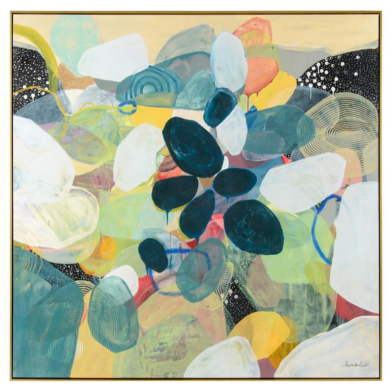 Adoration by Heather Ward Miles shows the artists signature style. With its playful colorful style, the art creates an upbeat feel. This piece is framed in a gold floater frame.