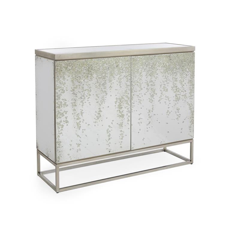 The two door fronts on this cabinet resemble a waterfall with the broken glass embedded in a high-gloss vitreous finish. The case is topped with modern mirror and outlined in pewter moldings. The base is in a finish of warm antique silver.