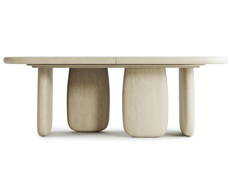 Oak Dining Table Top with one 24" leaf in Clay finish. Four Robust Shaped Legs in Wood Grain Texture Cast Resin in Clay finish. Adjustable glides.