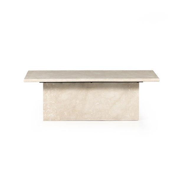 Inspired by Italian design of the 1970s, a monolithic coffee table is made entirely from solid marble in a soft cream.