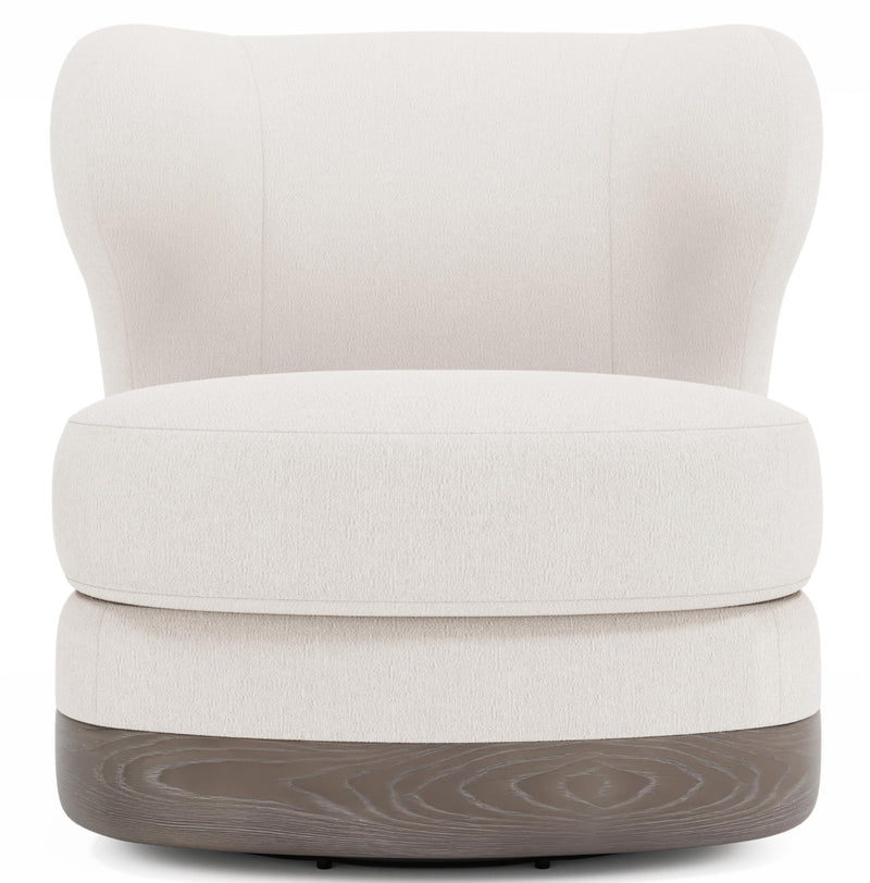 A textured wood base adds a unique detail to this wingback swivel chair.