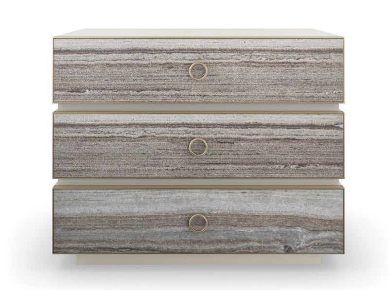 Grounding the room with a soulful sophistication, the Bedrock nightstand introduces a compelling mix of texture and material. Drawer fronts are crafted from polished gray sandstone, minimally adorned with metal trim and small ring pulls in Champagne Gold. Softly contrasted by a creamy Almond Milk finish, its intricate banding and natural color variations create an organic yet elegant aesthetic in any space.