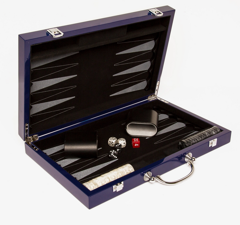 A classic game in a contemporary case. Add backgammon to your collection in this custom full blue lacquer case with black velvet lining. Features high gloss wood box with blue carbon fiber finish for dice and chips and velvet lined game base.