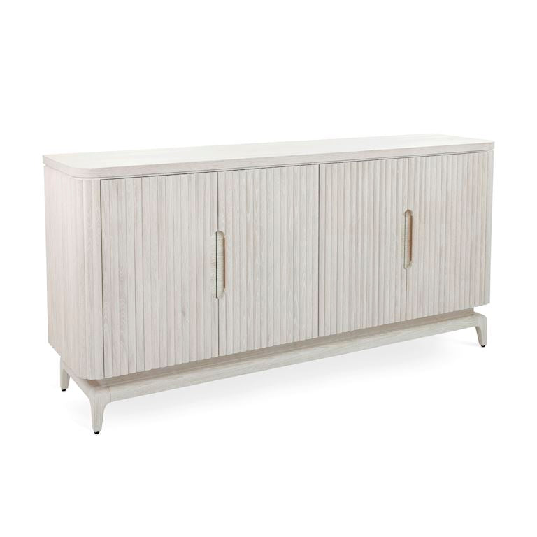 The Brezza Credenza is an elegant contemporary design showcasing sophisticated neutral tones. Crafted from oak wood with a gorgeous White Washed finish, the frame demonstrates a fluted pattern adorning the four cabinet doors. Both pairs of doors feature groove handles with steel inlays, revealing a tasteful striped pattern finished in a Natural Silver finish. This delicate statement piece possesses two interior compartments with a single adjustable shelf.