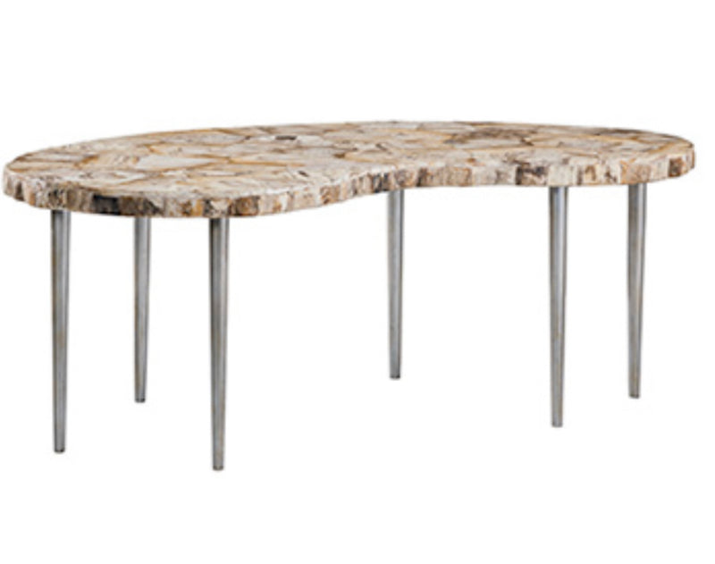 Asymmetrical, shapely live-edge cocktail inlaid with Petrified Wood, standing on tapered iron legs in a silver finish with a hint of gold. While solid Petrified Wood items vary greatly from piece to piece, we have selected a color range for the veneered tops on Caldera pieces that will result in beautiful earth tones. Petrified wood coloration will vary from top to top.