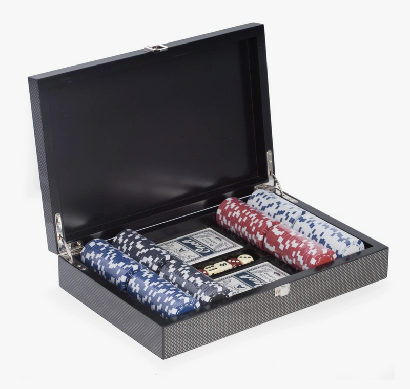 Poker set with 200, 11.5 gram clay composite chips, two decks of playing cards and 5 poker dice in carbon fiber storage case and chrome plated hardware.