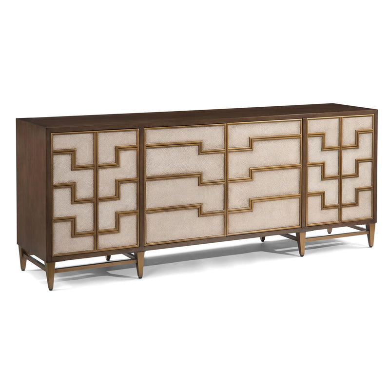 The case of this four-door sideboard is ash veneer finished in a warm nut brown. The door panels feature double wood moldings in an antique brass finish that tie them together in an interesting linea pattern, breaking each into separate areas of pebble shagreen which are finished in antique beluga with a warm wash. The base is in an antique brass finish. Soft-closing hinges are fitted on the doors.
