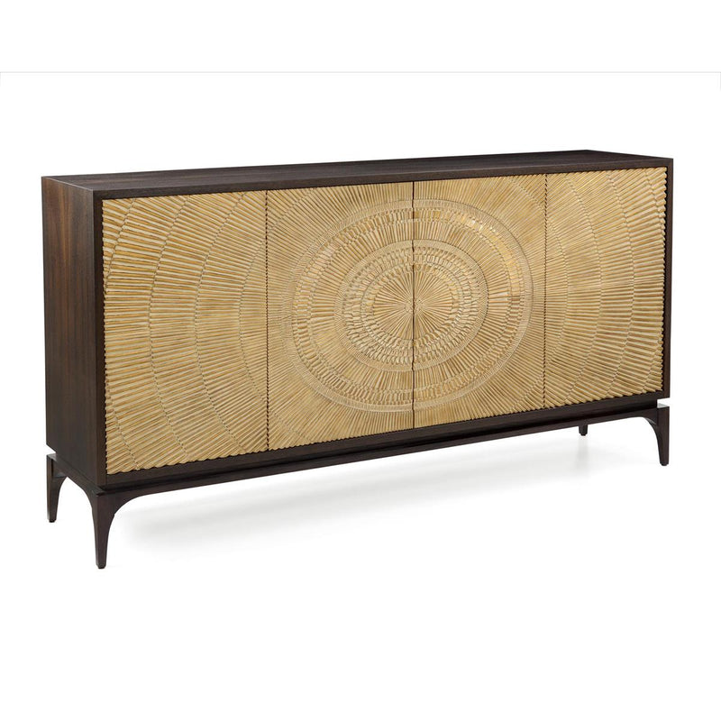 The four doors of this cabinet, set within a smoked oak case, have a radiating spiral pattern from the center in a dusty gold finish. Two interior compartments each have a single adjustable shelf. Push-latches and European hinges are fitted throughout.