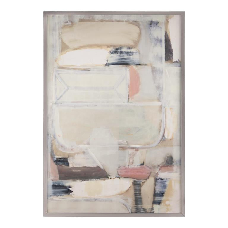 Vaporize by artist Michael Cusack is a contemporary painting on canvas that combines geometric forms with freeform shapes and ethereal hues. The piece features refined tones of gray, pink, and white with a textural satin gel, bringing an alluring sense of depth to any space. The artwork is displayed in a sleek wood gallery frame with a gunmetal finish, designed for vertical display only.