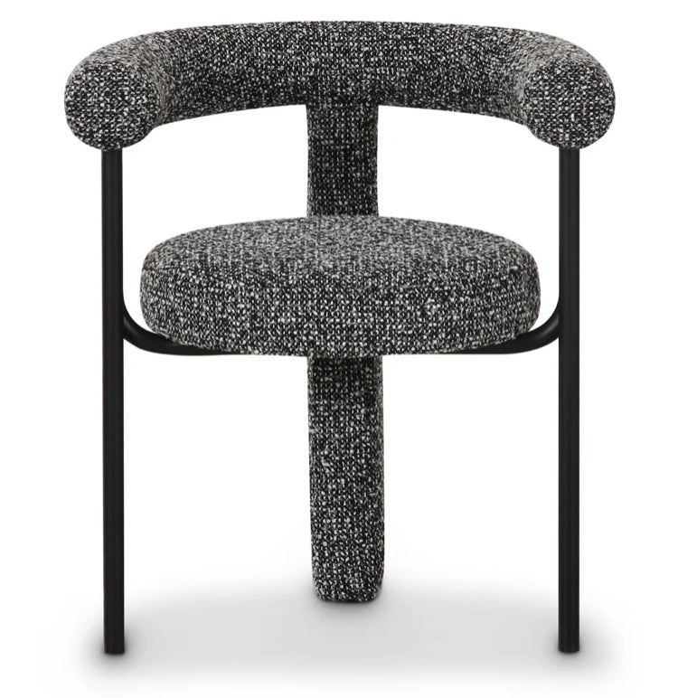 This Dining Chair brings a postmodern punch to your dining space with its sculptural curves and artful tubular design. Wrapped in textured black performance boucle, its padded shelter back and sleek arms offer a cozy embrace while tucking neatly under most standard dining tables.