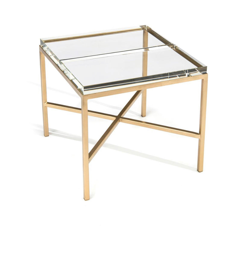 A bunching table has a top of double-glass blocks and a base in a gold finish.