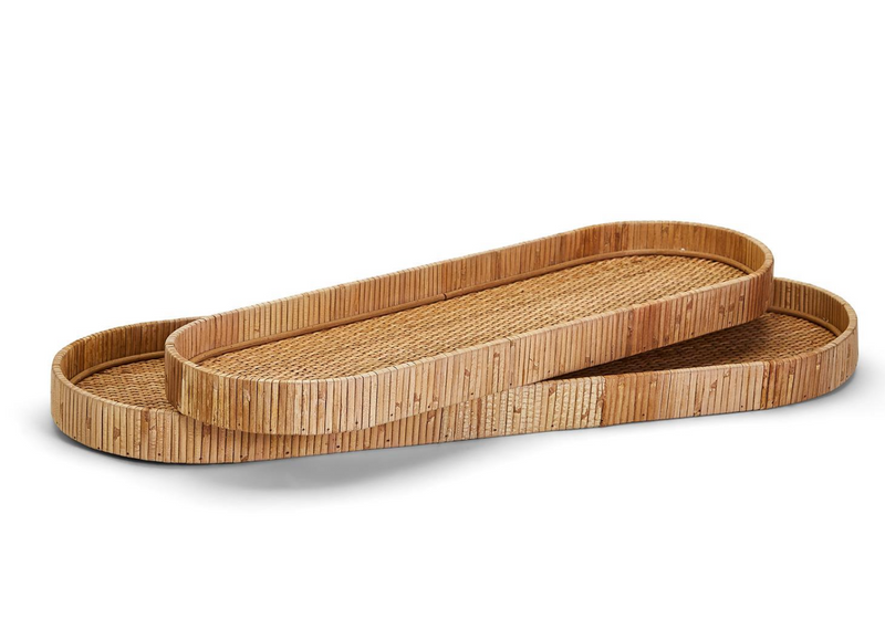 Oversize trays are in. For use all over the home for decoration or to serve on. These oval trays are made of natural rattan. Brings natural color palette to the home
