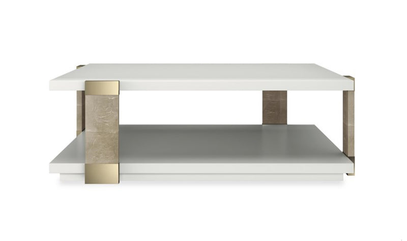 This square coffee table presents a beautiful balance of linear forms and light. Its Almond Milk tabletop and shelf appear to float within Oracle hand-applied leaf wood posts. Whisper of Gold metal accents trim the top and bottom of each post, adding a dressed up touch to this piece.