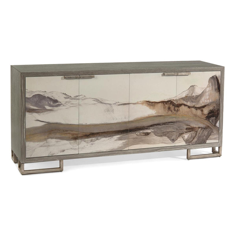 This sideboard features an original work of Oriental art printed on rice paper and inlaid across the four doors. The cabinet is in oak and finished in grey driftwood. The steel frame feet and handles are finished in silver white. There is an adjustable shelf behind the doors, and soft-closing hinges are fitted.