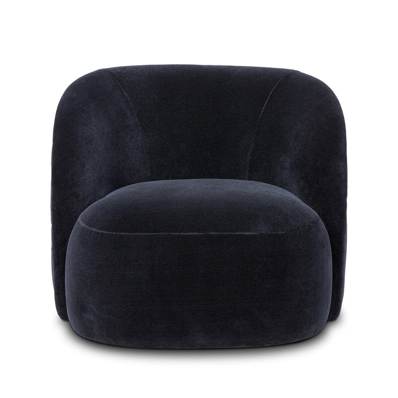 Low in profile with tight, impeccable tailoring, a 360-degree swivel chair is upholstered in a velvety navy wool blend, with top-grain leather piping for an intentional, elevated look. Foam cushioning and S-spring suspension ensures comfort.