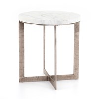 Modern materials meet geometric edge, bringing elegance to the bedside. An aluminum base of brushed nickel intersects to create clean right angles, with a thick tabletop of polished white marble.