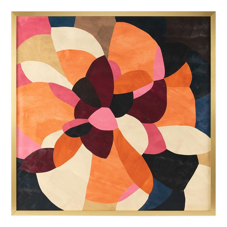 Thrive by artist Maja Gunnarsdottir is an abstract print on canvas, showcasing vibrant florals in rich, expressive tones. A matte gel captures textural brushstrokes, bringing the artwork to life. The piece is presented in a gold gallery frame, completing the look.