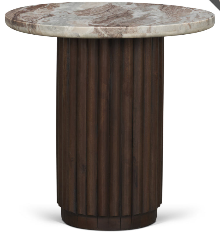 The Marbrello Side Table features a round solid pink marble top set on a fluted espresso base with a recessed bottom.