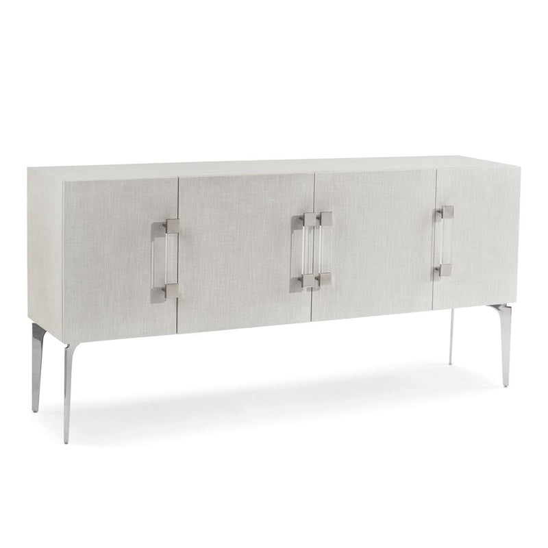 A four-door sideboard inlaid in linen and finished in white lacquer sits atop polished stainless steel legs. Three compartments behind the four doors are each fitted with a single adjustable shelf. Acrylic and polished stainless steel hardware decorate each door.
