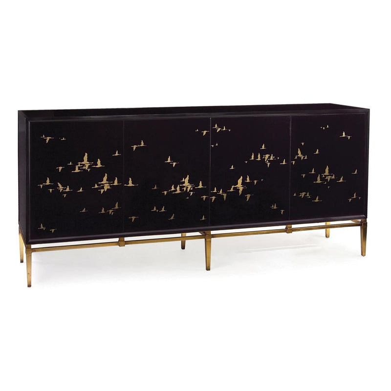 The gold migrating birds are reverse-painted on black glass. The credenza has a black glass top and sides and is mounted on a six-legged frame finished in old gold. The doors have auto-latches.