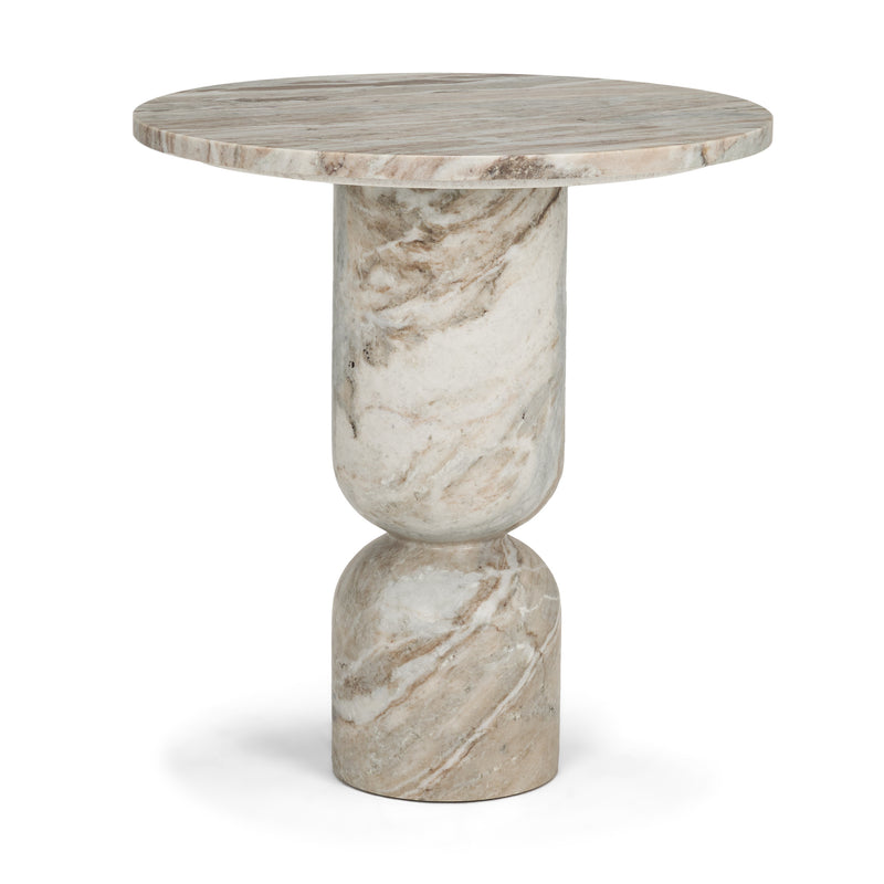 The Nylah is a luxurious accent table crafted from solid pink marble, featuring a round top and a bold, stacked geometric base.