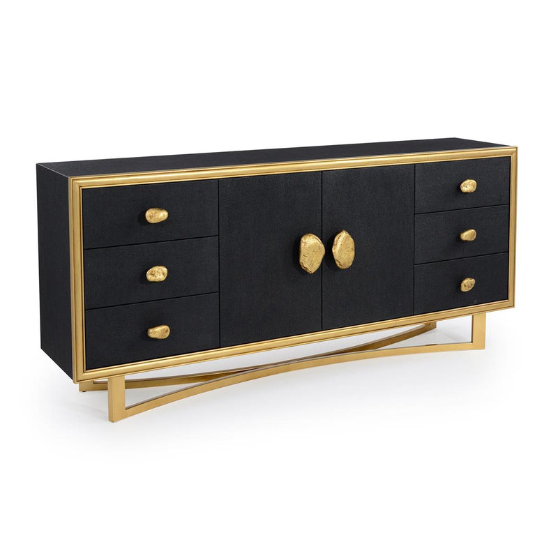 Encased in a black linen finish, the two doors and six drawers of this sideboard showcase organic formed pulls and metal base in exotic gold. Soft-closing hinges and drawer runners are fitted throughout.