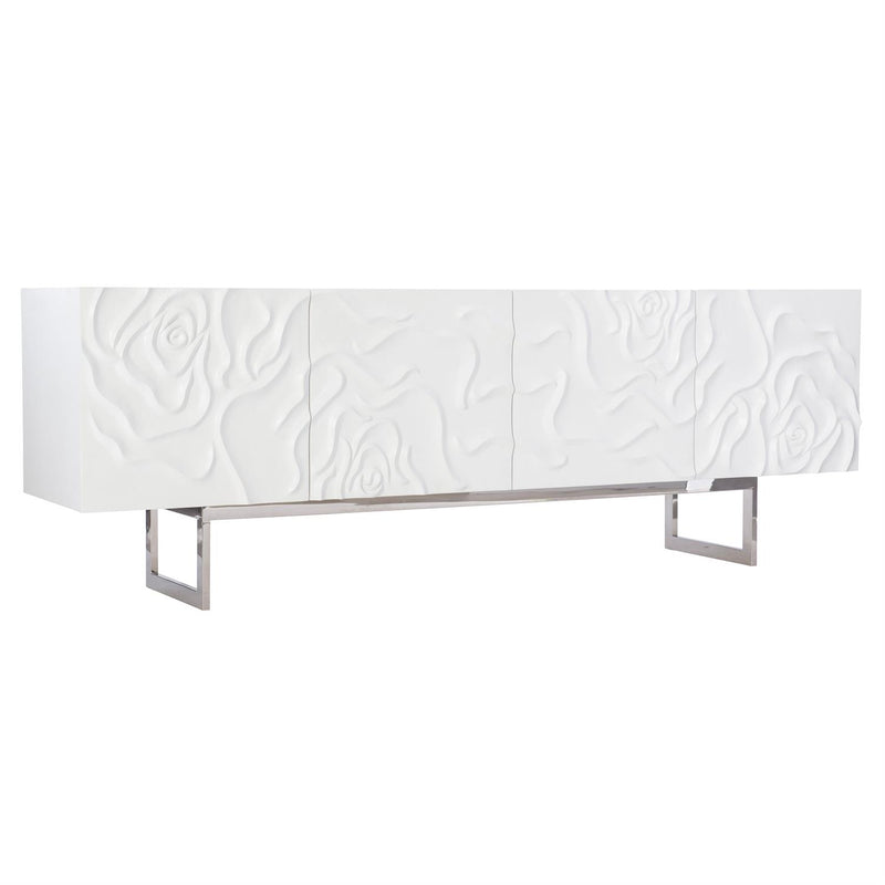 This stunning modern credenza makes an elegant statement with a floral pattern carved in white plaster.