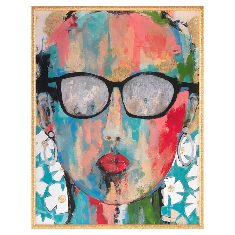 Rhythm Divine by artist Joan Curtis is a vibrant wall panel printed on canvas. Splashes of red, blue, and green are accentuated by yellows adorned in gold leaf to create a stunning visage. The subject is wearing earrings and glasses, both embellished in silver leaf and stands in front of a gorgeous backdrop of gesso flowers. The piece is displayed within a textured gold frame, beautifully complementing the opulent accents on display.