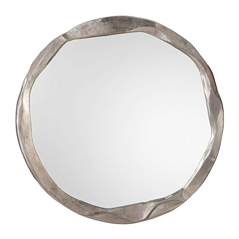 Crafted from enameled metal in a nickel finish, the Ruga Mirror is a textural marvel that commands attention within a space. Showcasing a gorgeous wrinkle effect throughout the entirety of the rounded frame, the piece breathes life into a space with alluring depth and dimension.