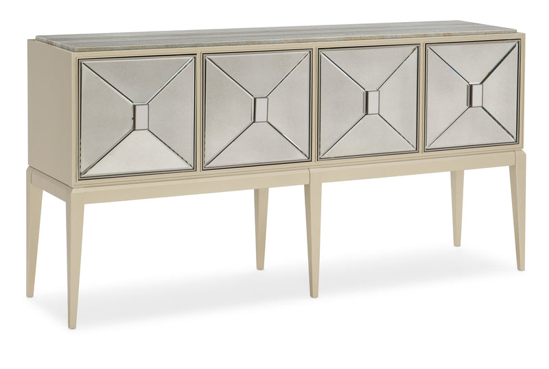 As glamorous as gold jewelry sparkling in the light, this brilliant glass console reflects beauty from every angle. It’s crafted of clear glass panels and features a glass top, glass end panels, glass shelf and four clear glass doors — all gleamingly reflected in its mirrored back and bottom panels. An elegant Whisper of Gold finish envelops its plated metal frame, adding contrast to its luminous surface. It's the perfect piece for displaying favorite treasures and collections.