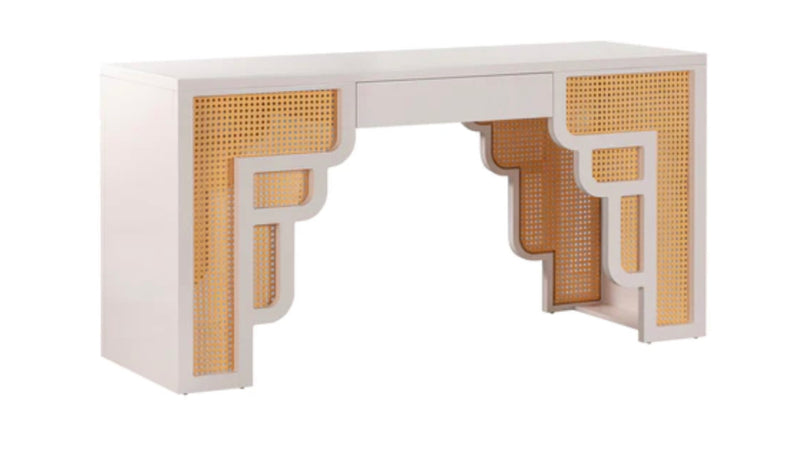 Inspired by the Art Moderne style, the Suzie Desk alludes to Palm Springs art-deco design through its bold colors and curvaceous form. This wooden desk features a soft close drawer for practicality; while its rounded edges and woven rattan details add a playful twist.
