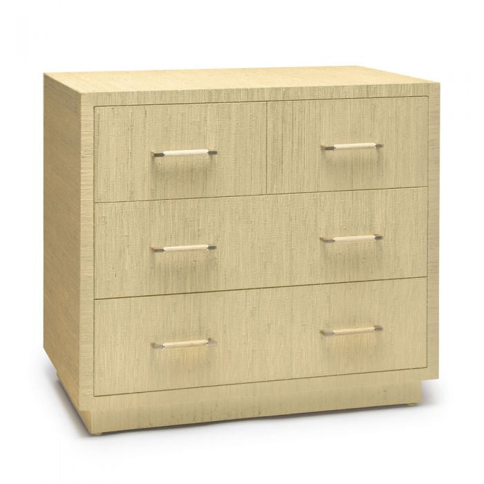 The clean lines of the Taylor 4 Drawer Chest are transformed into an organic statement piece thanks to a natural sisal texture and iron pulls in champagne silver.