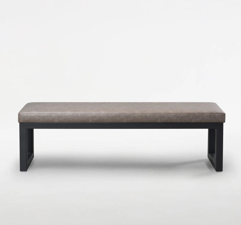 This bench features a modern design with a cushioned seat available in a wide range of fabrics. It is supported by a simple and sleek steel frame.