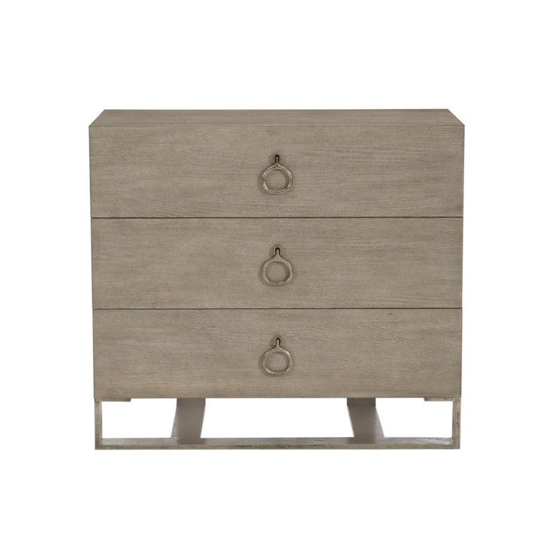 Pairing wire-brushed oak with heavily textured metal, this rustic modern nightstand offers sophisticated style with a relaxed feel.