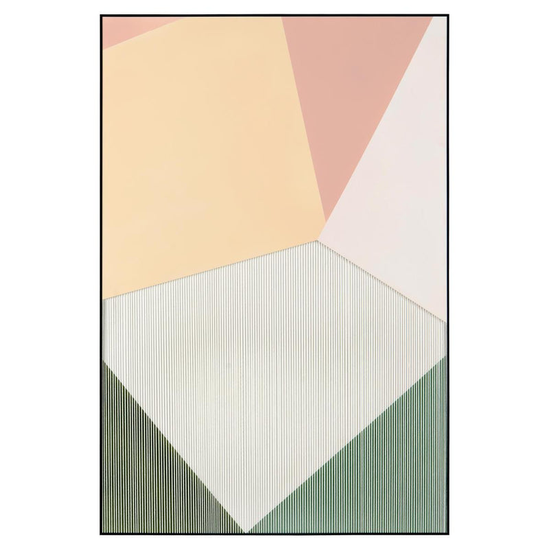 Wing’s Pastel Prisms showcase alluring geometric forms and a soothing color scheme of pastel white, red, yellow, and green. The top half of the piece displays solid shapes, while the bottom half consists of colored threads, creating gorgeous striations that contribute depth, texture, and tasteful visual interest to a space. The juxtaposition between solid shapes and linear gaps gives the piece a unique edge that will attract attention and spark the imagination. A black metal frame provides playful contrast to the soothing pastels and bestows the piece with subtle contemporary flair.