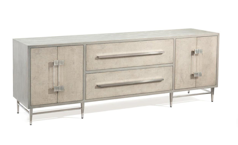 The cabinet is finished in grey oak, while the doors and drawers are finished in artistico gesso, a hand-embellished, embossed, and distressed finish. The doors have acrylic handles capped with stainless steel ends to match the drawer handles and base frames.